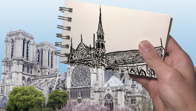 Why: After the terrible fire that destroyed Notre Dame, I felt the loss of this beautiful architectural landmark and had to recreate it in all of its glory. I decided to draw it on my visual diary because even a small drawing or memory of it allows one to recall its original splendor.