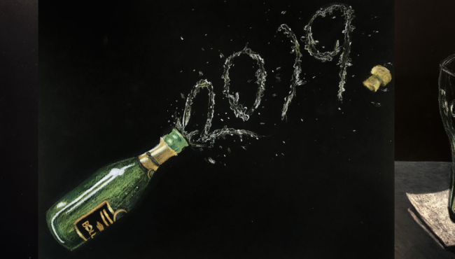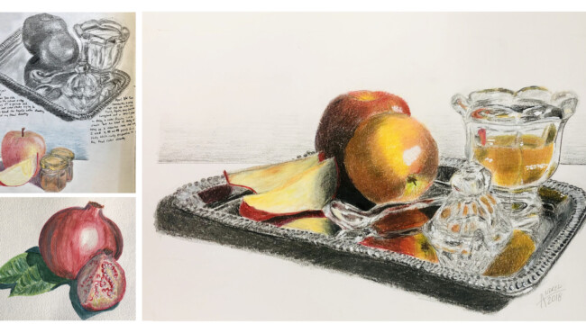 Why: The Jewish New Year has the symbolic fruits of apples with honey and pomegranates for a sweet new year. I did a value and color study on apples and honey to learn how to best depict them. I ultimately chose prismacolor pencils for the vibrancy and detail they provide, especially in representing the value of the apples and reflections of the glass.