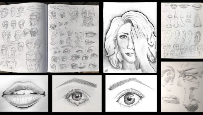 Process: Multiple images of different facial features to learn about the head’s structure and practice skills, shade, value, blending and proportion.